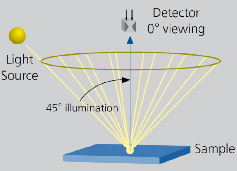 The other type of color instrument is defined as a 45/0 device. In the picture below, the light source illuminates the object as a 45° angle, but only light reflected perpendicular to the surface (the 0° angle) is collected.